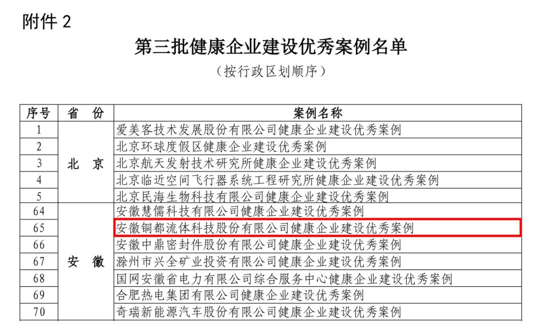 2024年5月6日國家衛生健康委辦公廳公布第三批健康企業建設優秀案例名單,銅都流體成功入選國家衛健委第三批健康企業建設優秀案例名單,成為安徽省6家入選優秀案例之一。