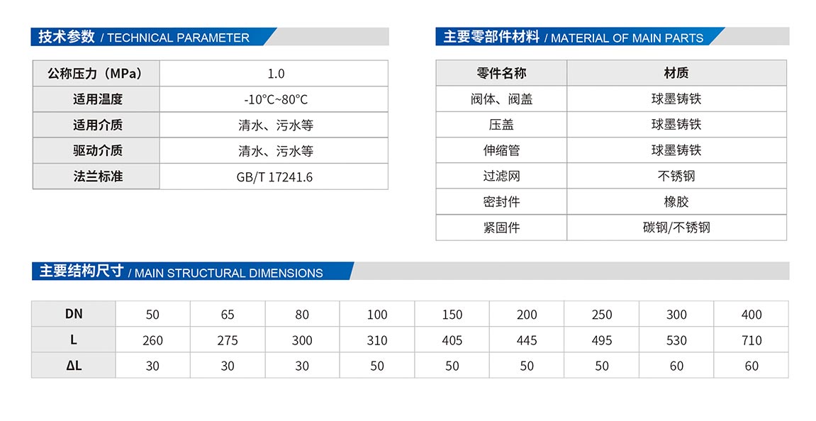伸縮過濾器是過濾器和伸縮接頭的組合,它也是輸送介質管道上不可缺少的一種裝置,通常安裝在減壓閥、泄壓閥、定水位閥或其它設備的進口端。當管道中的介質進入過濾器時,介質通過濾網進入被連接的閥門中,而雜質則留于過濾桶內,使各類閥門不會由于機械雜物卡入密封圈而失靈。另加不銹鋼伸縮拉桿,補償管道尺寸,安裝靈活。
