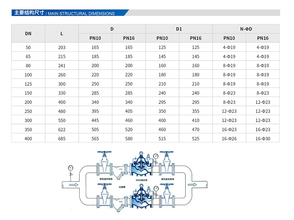 主要控制主閥的固定出口壓力,主閥出口壓力不因進口壓力變化而改變,亦不因主閥出口流量的變化而改變其出口壓力。適用于工業給水、消防供水及生活用水管網系統。