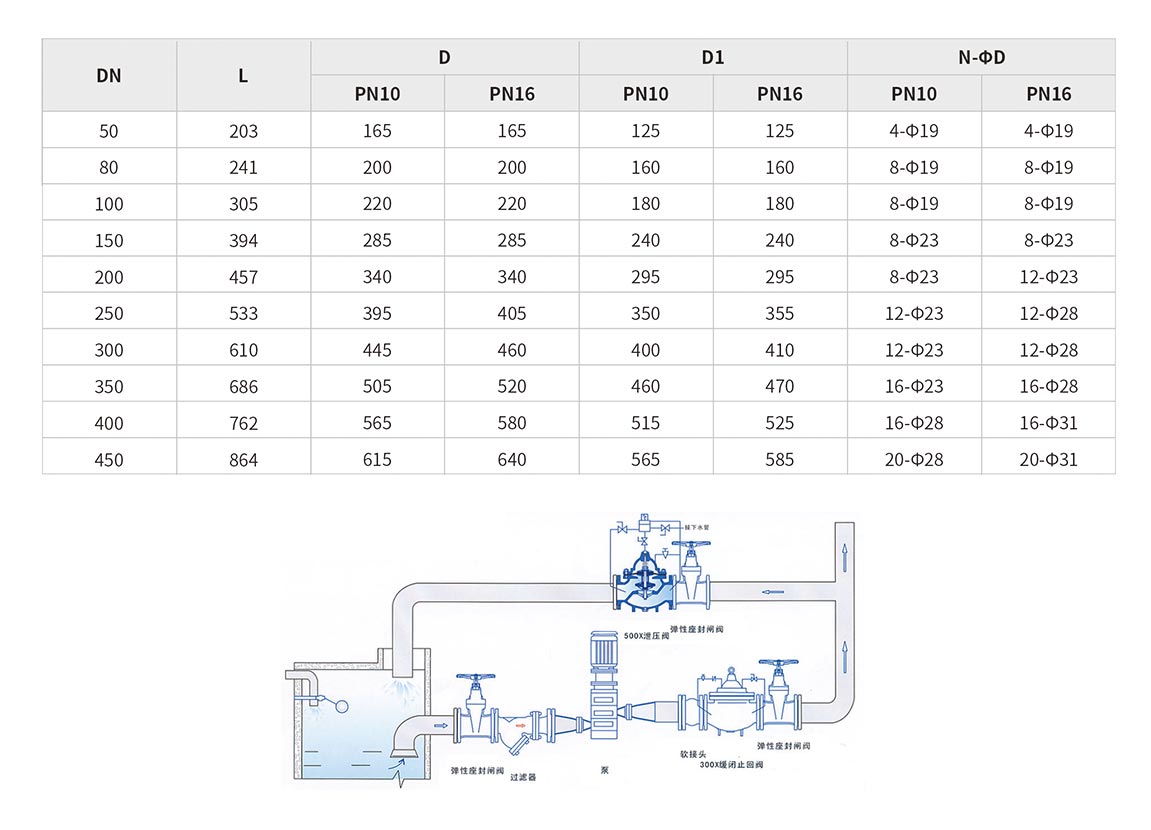 500X泄壓/持壓閥主要用于消防或其他供水系統中,以防止系統超壓或維持消防供水系統的壓力。消防泵關閉后還可以減小水錘的沖擊。也用于大型供水系統的水錘消除裝置,并且閥門控制系統的進口處裝有一個自清潔濾網,利用流體特性,使比重較大、直徑較大的懸浮顆粒不會進入控制系統,確保系統循環暢通無阻,使閥門能安全可靠地運行。系統動作平穩、強度高、使用壽命長適用于DN600口徑以下的管道。